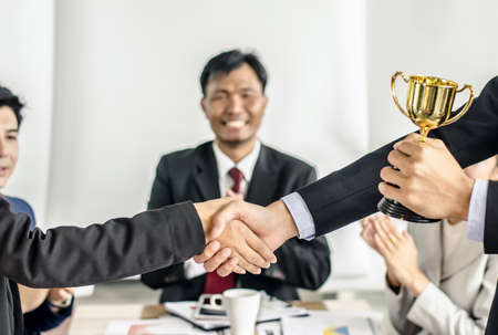 motivation of business success. trophy and prestige. got prize. guy celebrate victory.