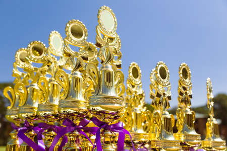 Shinny golden sport trophies lining up on an outdoor table against deep clear blue sky, ready to be handing out to the winners at a sport competition