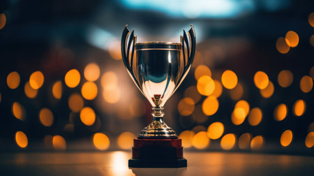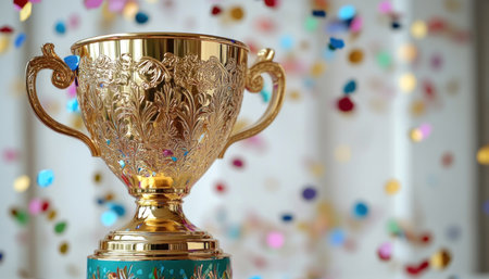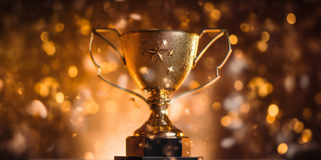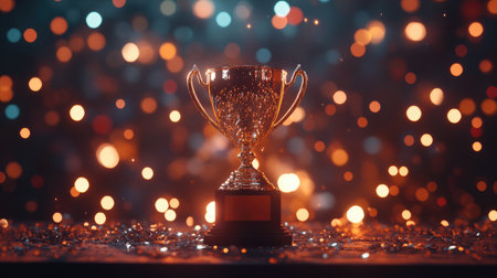 A golden trophy cup with confetti on table and glowing bokeh lights background, symbolizing achievement and celebration