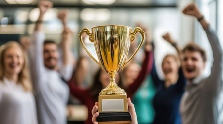 A gleaming golden trophy with a jubilant team celebrating in the background, symbolizing hard work, achievement, and recognition.