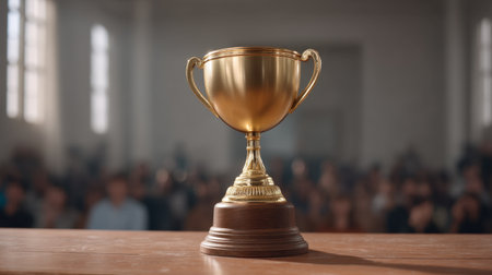A shining trophy sits on a wooden table, symbolizing achievement. The blurred audience in the background adds a sense of celebration and recognition to the moment.