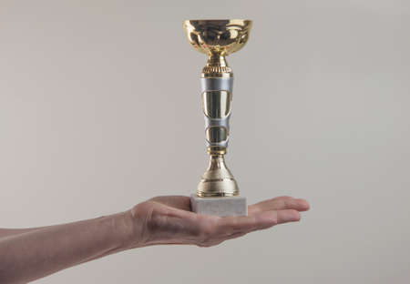 Hand holding up a gold trophy cup as a winner in a competition
