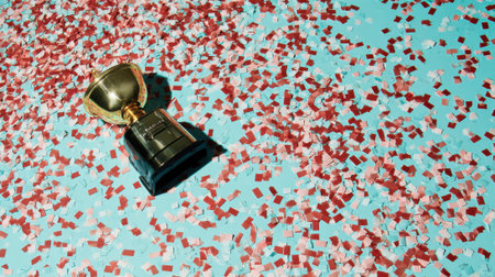 A golden trophy lies on a light blue surface covered in scattered red confetti, symbolizing celebration and achievement.