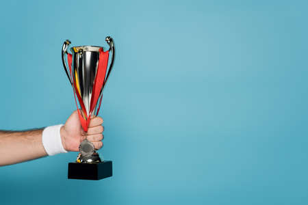 cropped view of sportsman holding trophy with medal on blue