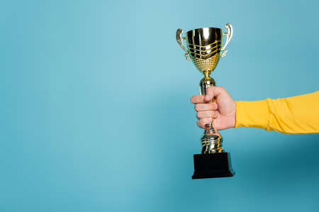 cropped view of man holding golden trophy on blue