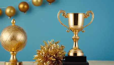 A shiny golden trophy cup sits on a table amidst a celebratory atmosphere with gold confetti falling around it, symbolizing achievement and victory in a competition or event.