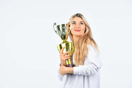 Competition winner. Happy woman showing her trophy. Sport success. Champion cup symbol of success. Successful sport career. Success concept. Just love to be best one. Congratulations concept