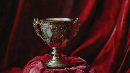 A stunning silver trophy resting on rich red fabric, symbolizing victory and achievement. Perfect for themes of celebration and recognition in various contexts.