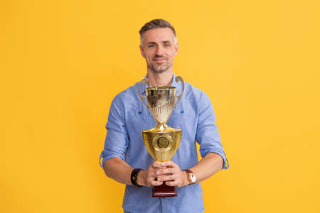achievement. copy space. mature businessman in suit hold golden cup. business success.