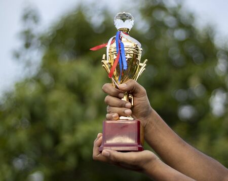 a golden color winner trophy held in hand with selective focus