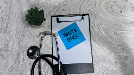 Concept of Health check write on sticky notes isolated on Wooden Table.