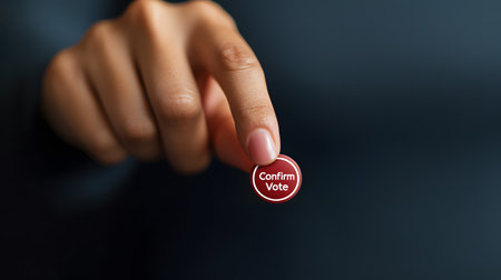 A close-up of a hand about to tap a 'Confirm Vote' button, highlighting civic engagement with a focus on democracy. Background appears dark.