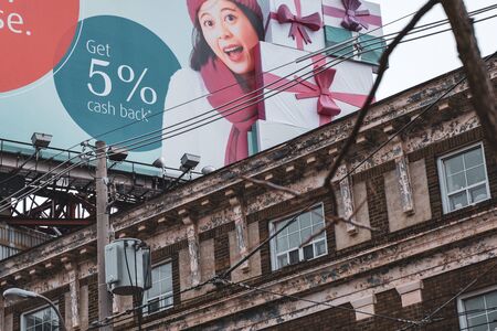 Toronto, ON Canada 12/27/19: Large billboard hovers over old brick apartment building on Queen Street in the Parkdale neighbourhood.