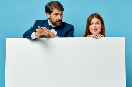 man and woman white banner isolated background presentation communication advertising