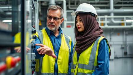 Engineers working in a factory. A diverse male manager trains a young female engineer wearing a hijab, pointing at a machine control panel in a modern industrial factory.