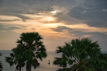 Phuket, Thailand 04.12.2021 View of a sailing boat between palm trees on the Andaman sea during during the sunset at Promthep Cape landmark viewpoint
