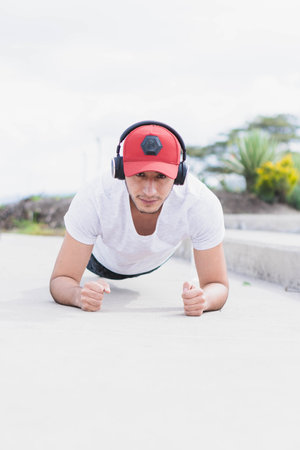 Young man is exercising outdoor. He is doing push-ups.
