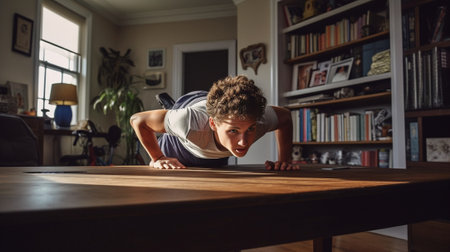 Handsome young man keeping plank position while exercising at home : Generative AI