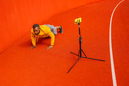 Afro American sporty man look at phone camera smiling, while doing plank exercise, practicing work out using webcam on smartphone on tripod. Positive active afro american do training online isolated