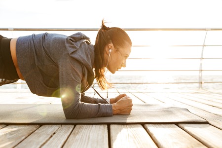 Concentrated sportswoman doing plank exercises on a fitness mat at the beach