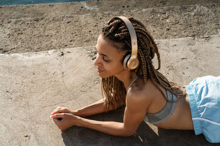 Athletic beautiful african woman in sportswear with headphones listening to music while relaxing on a beach, laying