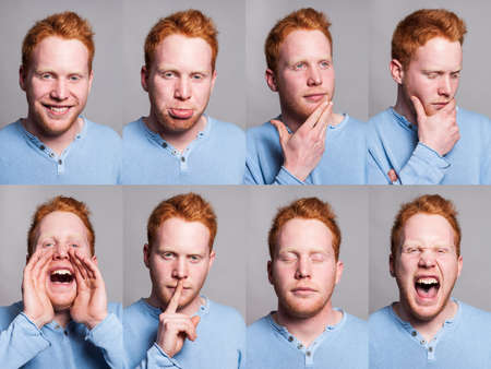 Young redhead boy acting with different and useful expressions.
