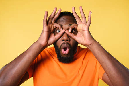 Man do glass with hands. wondered and shocked expression. yellow background