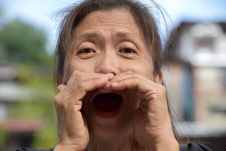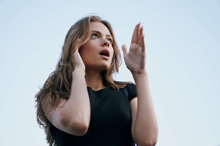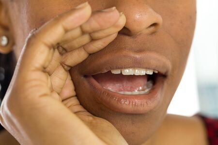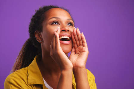 Young screaming African American woman calls for help with hands to mouth
