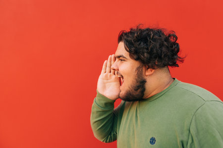 Side view of a handsome overweight man with a stylish haircut and beard, shouting, calling someone, feeling happy, expressing positivity, standing on a red background.