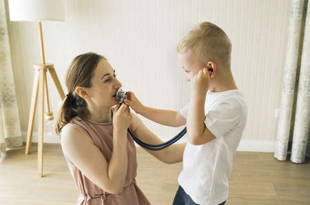 The boy listens through a stethoscope to what his mother is telling him. children's games