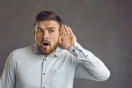 Omg I can hear them talk about something interesting. Curious attentive guy isolated on gray background puts hand to ear overhearing top secret information or listening to hot news and shocking gossip
