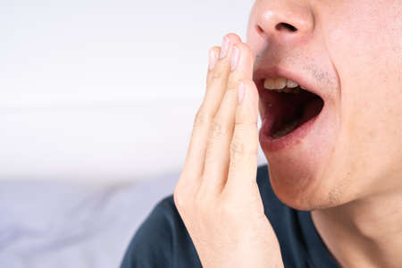 Asian man are yawning covering open mouth with hand after he wake up. Healthcare medical or daily life concept.