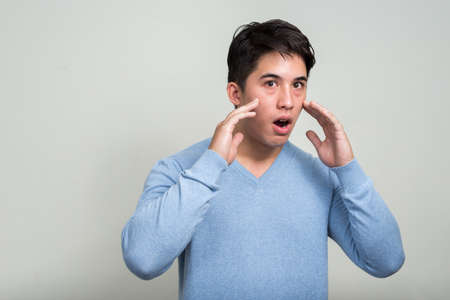 Cute young white guy with dark hair in a blue T-shirt stands sideways and putting his hand to his mouth screams. The image of a screaming guy, reports the news, an important news. Copy space.