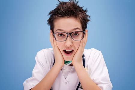 Young boy playing a doctor. Conceptual photo. Blue background.