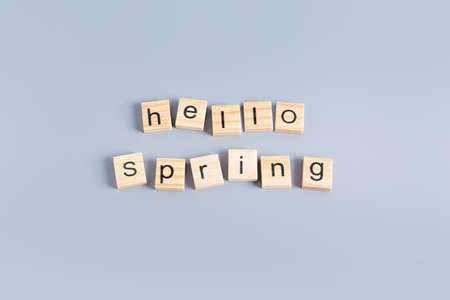Hello Spring - words laid out on wooden blocks on gray background top view.