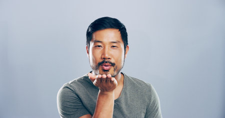 Portrait, asian man and blowing kiss with romance for love, affection or greeting on a gray studio background. Creative, male person or model with care, palm or flirt in distance on mockup space