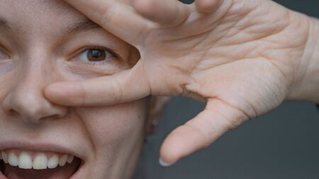 happy young woman laughs and makes a hand gesture, two fingers up. Super close-up, portrait without retouching and without makeup, real natural Mature facial skin