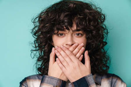 Caucasian beautiful curly girl posing and covering her mouth isolated over blue background