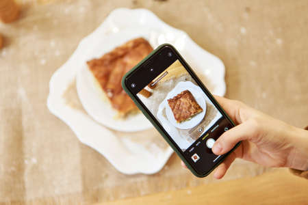 Close up - Woman hand taking photo with smartphone in bakery shop. Camera eat first.