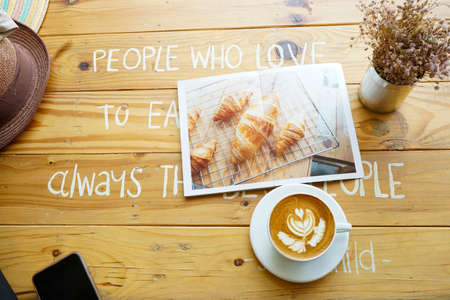 white latte coffee cup on wooden table with picture croissant, hat and cell phone.