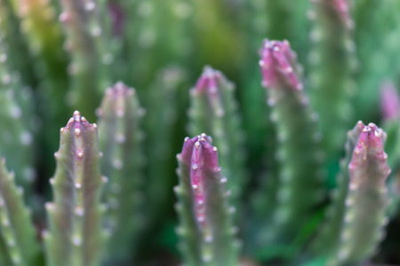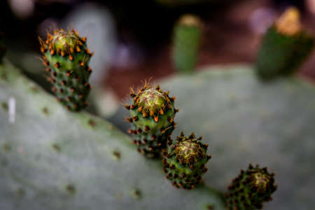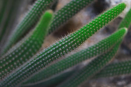 Green dusty cactus with big black spikes close-up macro background. Selective focus and image with shallow depth of field