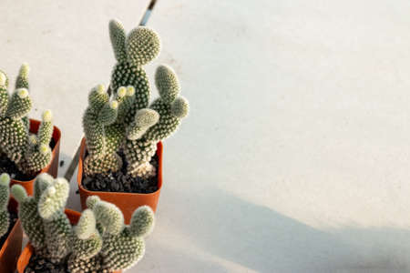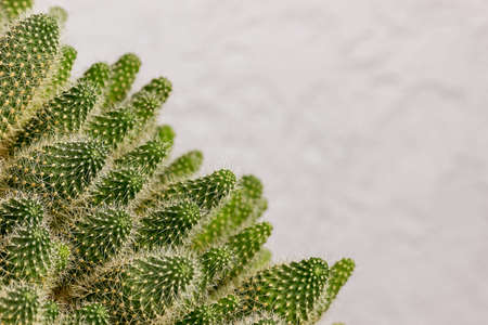 Green cactus with shadow on gray concrete wall with copy space on right. Tree or plant on grey wallpaper or background with light in the morning.