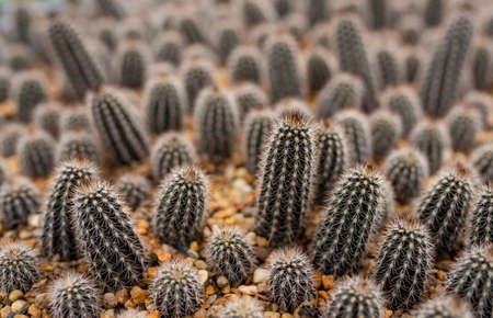 Mammillaria cactus, succulents plants with round shapes, and yellow thorns in the rock garden.
