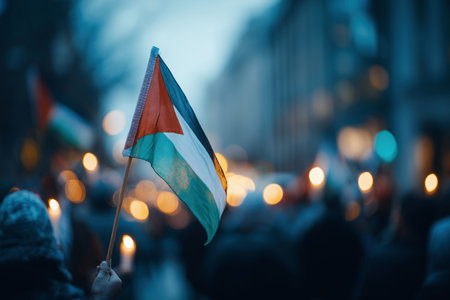 Palestine flag waving gently in the wind, peaceful protest atmosphere, soft lighting, people in the background holding candles and signs of peace, unity AI Generated