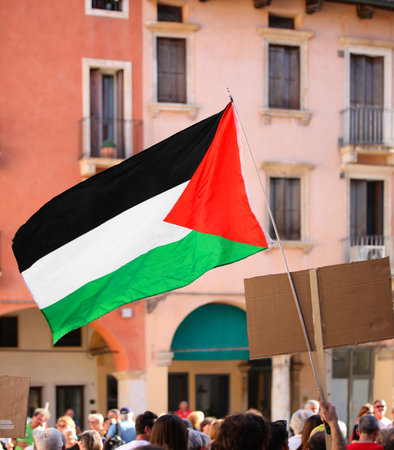 Palestinian Freedom Protest. Conflict and war concept. Palestine vs Israel. People of Palestine raising Flags in the city Copy space Space for text