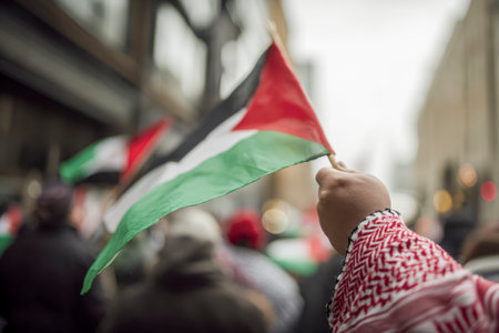 Figure clad in a keffiyeh holds a large Palestinian flag aloft in a demonstration, a symbol of identity and resistance