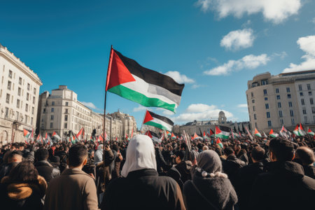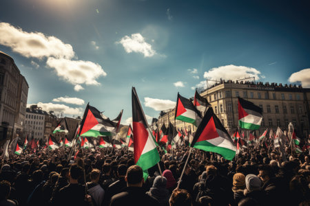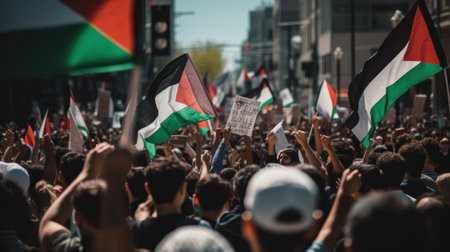 Thousands of people with palestine flags rallying in the street a crowd waving flags during protest