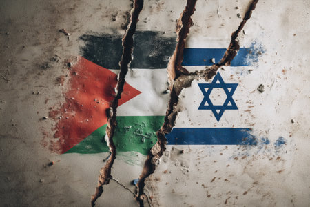 A weathered wall displays fractured Palestinian and Israeli flags symbolizing division and conflict in the Middle East. Powerful imagery for news or political commentary.