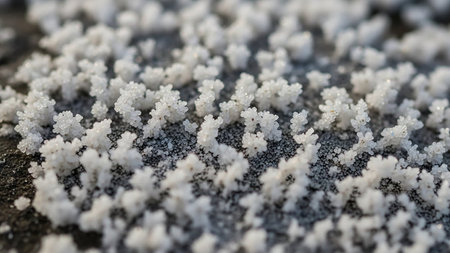 Photo showing extreme close-up of tiny crystalline structures on a dark surface. High resolution image suitable for commercial use.