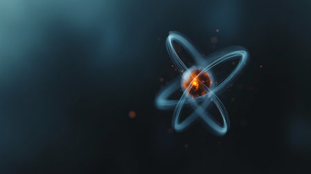 A nucleus glows brightly while electrons in defined orbits surround it. Energy particles are being released as it spins within a dark void.